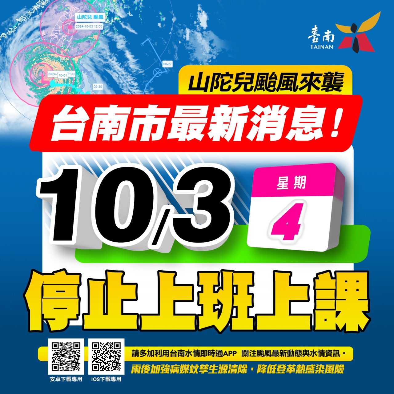 因山陀兒颱風來襲,臺南市政府宣布10/03(四)全天停止上班、上課,本局永華文化中心管理科轄下臺南文化中心、歸仁文化中心、台江文化中心及新化演藝廳各場館暫停開放。